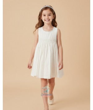 Vestido de manga sisa color blanco roto con detalles de tiras bordadas en el cuello y en la cintura en color blanco roto.
