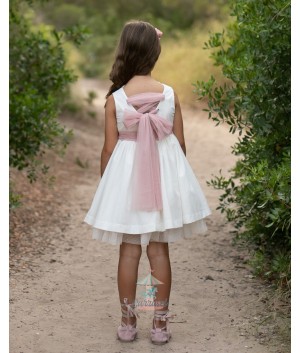 Vestido blanco de tul y plumeti con manga sisa y detalles de volantes y cintura de tul de color malva. Flor no incluida.