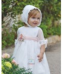 Vestido de plumeti de color blanco con tul color salmón con detalles de flores. Incluye capota.