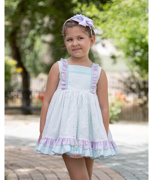 Vestido de manga sisa en color malva y blanco con detalles de perforados y volantes.
