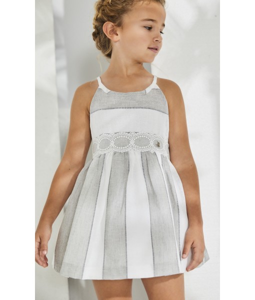 Vestido de rayas gris, con detalles de encaje debajo del pecho y la espalda.