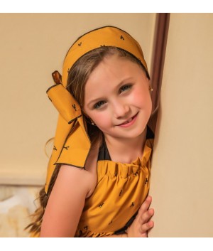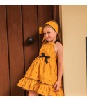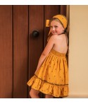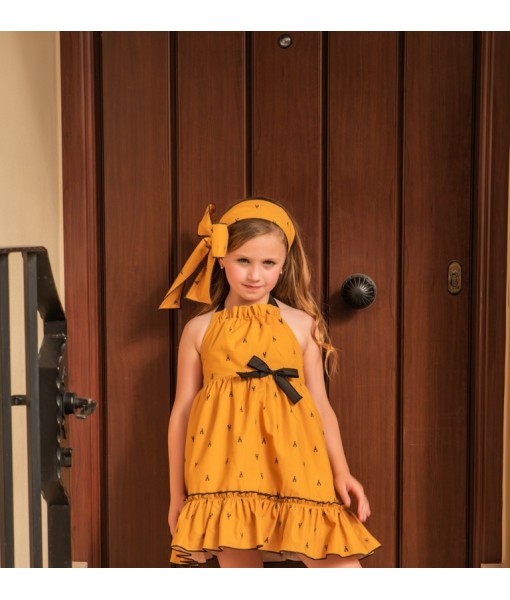 Vestido amarrado al cuello con espalda descubierta, color mostaza con estampado de cangrejos, en tonos mostaza y negro.