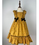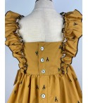 Vestido de color mostaza con estampado de cangrejos y detalles de lazos.