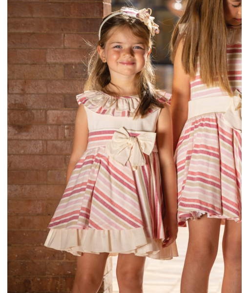 Vestido de rayas en tonos rosas y beige con detalles de lazos y cuello. Incluye capota.