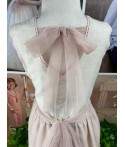 Vestido de semihilo de manga corta con detalle de puntilla en falda y mangas. Color blanco con lazo de color rosa maquillaje.