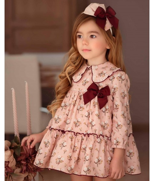 Vestido de manga larga con cuello y de color rosa con detalles en burdeos y estampado de flores.