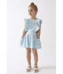 Vestido en color celeste con estampado de abejas, tirantes cruzados en espalda regulables. Volantes en la parte delantera.