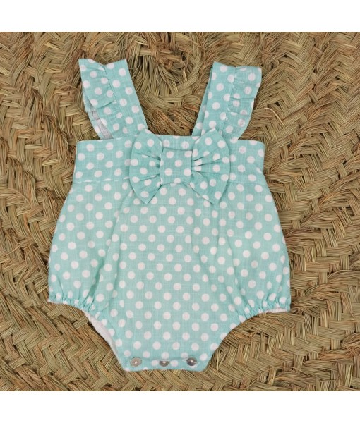 Pelele 100% algodón estampado de lunares con volantes en las tirantas y lazo en el pecho, tacto muy agradable.