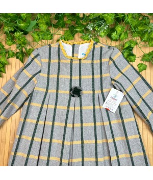 Vestido de manga larga de color gris con líneas de color verde y amarillo con detalle de flor.
