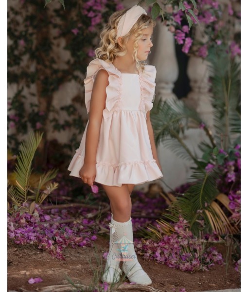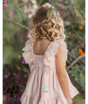Vestido con manga sisa y falda con carruchas de color rosa maquillaje.