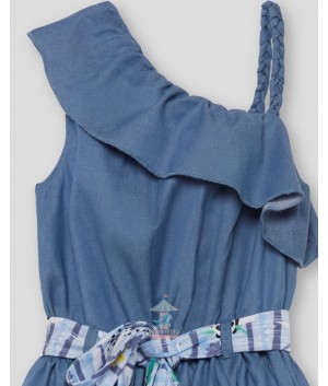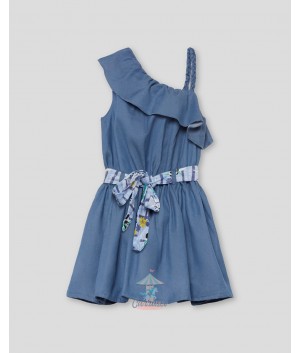 Vestido vaquero para niña. Vestido en tejido denim ligero con un favorecedor diseño asimétrico de un solo tirante y detalle de volante cruzado en el delantero. La cintura elástica se realza con un cinturón estampado que añade un toque de color y frescura.