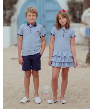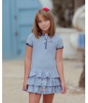 Vestido polo de manga corta de color celeste con falda de volantes.