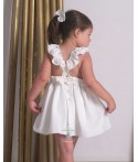 Vestido de plumeti de manga corta con detalles de volantes en cuello y mangas. Color blanco con tul de color celeste. También disponible en color celeste y color verde jade.